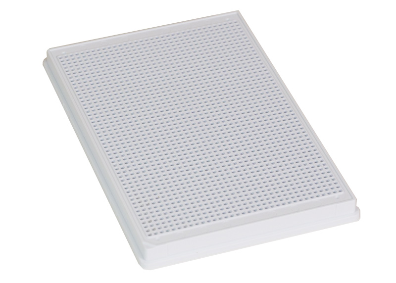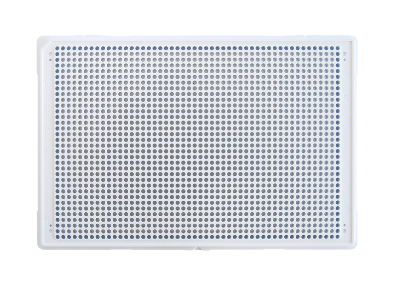 1536 Well MaKO plates are available in Black, White or Clear with solid-bottoms or 100 micron-thick film bottoms. 1536 Well MaKO plates have round wells and a HiBase configuration. 1536 MaKO plates have a built-in Evaporation Barrier (EB) row of wells surrounding the assay well field that can be filled to help prevent differential liquid evaporation from the edge wells. 1536 MaKO have built-in alignment fiducials used in Acoustic Dispensing systems. 1536 MaKO plates are available Tissue-Culture Treated for assays using cells with a small bottom surface area (1.85mm2).. The film-bottom configurations are ideal for fluorescence assays. 1536 Well MaKO plates have low-dead-volume characteristics (total useable volume 8.75μL). All Aurora plates are available with standard or customer bar-coding.