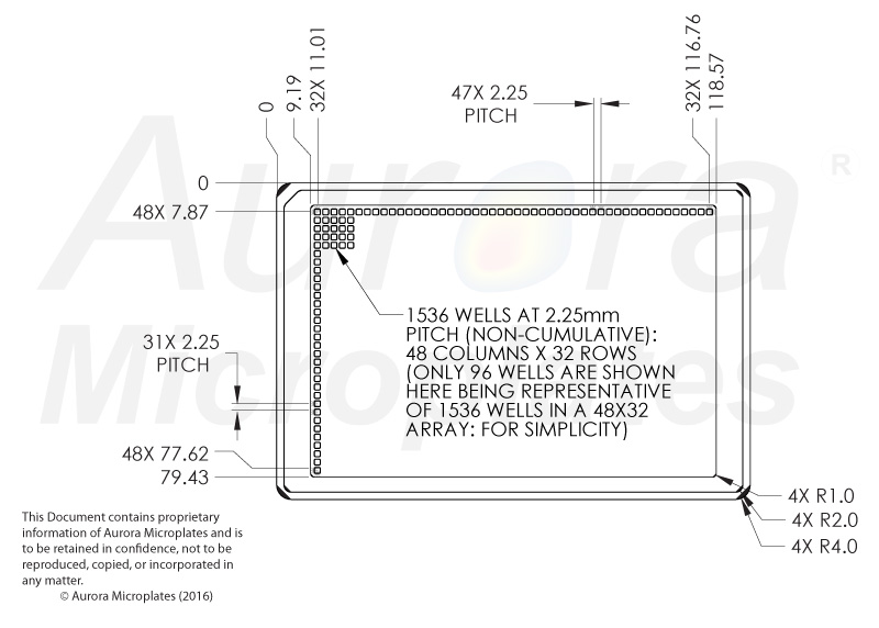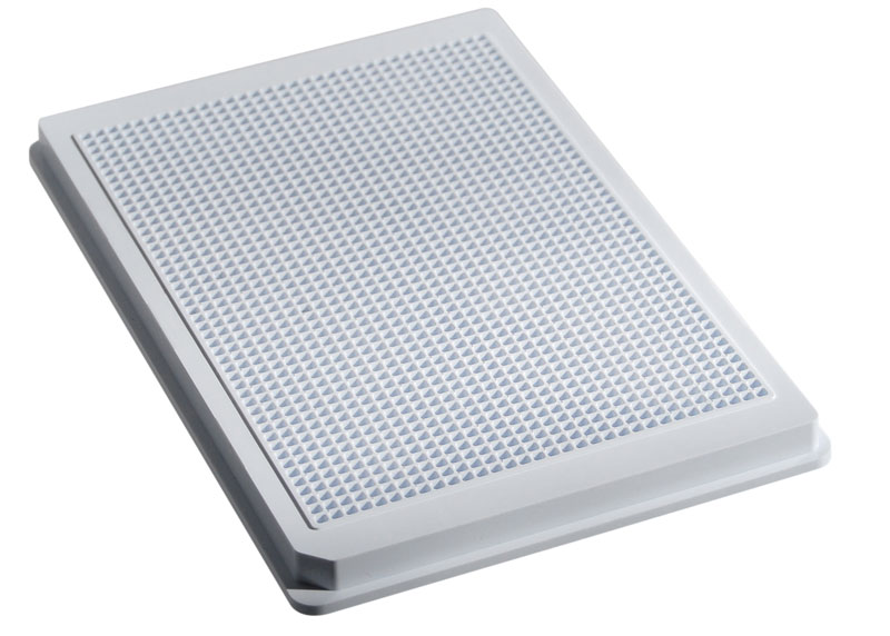 1536 SQ well HiBase plates are available in Black, White and Clear with solid-bottoms. 1536 SQ HB plates are available Tissue-Culture Treated for assays using cells with a 2.3 mm2 bottom surface area. 1536 SQ HB plates have a very consistent bottom thickness making them ideal for compound storage and retrieval using pin-tools or Acoustics. The tapered well shape and size (5mm well depth) enables a low-dead-volume (10.2uL useable volume) result reducing waste and un-used material. All Aurora plates are available with standard or custom bar-coding.