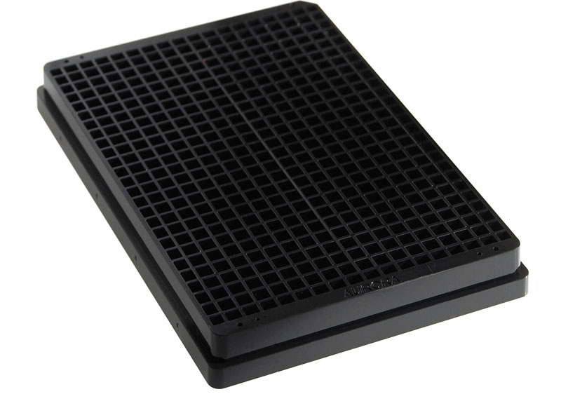 384 IQ LV plates are Imager-Quality Low Volume plates that are available with either 100 or 188 micron thick film bottoms. Available in Black, White or Clear, these plates have Low Volume (48μL) round wells and a perimeter area that can be used to help prevent differential liquid evaporation from the edge wells. 384 IQ LV plates are available Tissue-Culture Treated for assays using cells with a 5 mm2 bottom surface area. These Film-Bottom plates are suitable for small-surface-area Imaging applications and are compatible with a variety of Microscope Imaging Systems. All Aurora plates are available with standard or custom bar-coding.