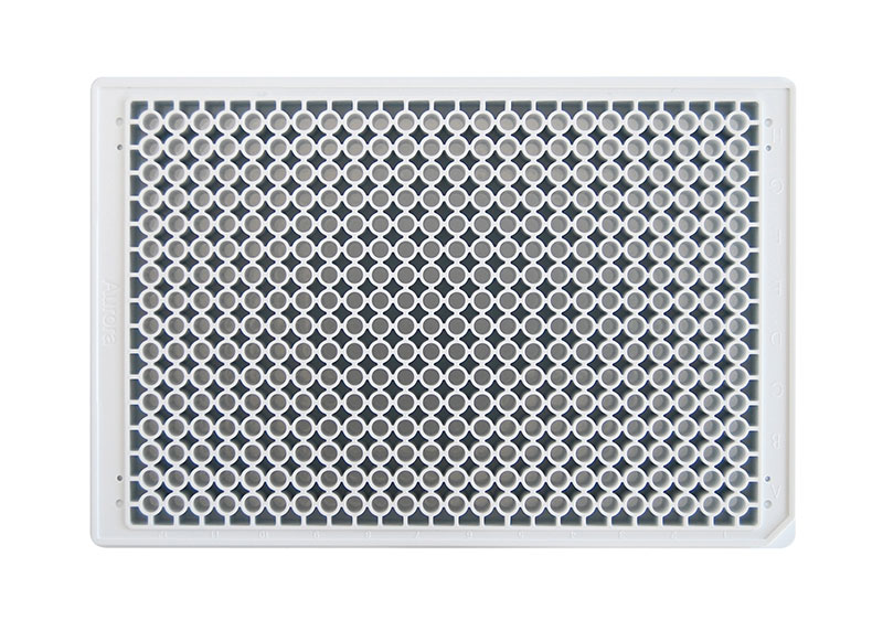 384 IQ LV plates are Imager-Quality Low Volume plates that are available with either 100 or 188 micron thick film bottoms. Available in Black, White or Clear, these plates have Low Volume (48μL) round wells and a perimeter area that can be used to help prevent differential liquid evaporation from the edge wells. 384 IQ LV plates are available Tissue-Culture Treated for assays using cells with a 5 mm2 bottom surface area. These Film-Bottom plates are suitable for small-surface-area Imaging applications and are compatible with a variety of Microscope Imaging Systems. All Aurora plates are available with standard or custom bar-coding.